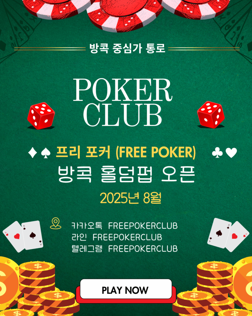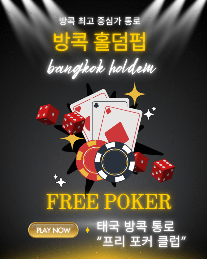 태국 방콕의 중심가 통로(Thong Lo)에 새로운 프리 포커 클럽이 문을 열었습니다. 저희 클럽은 방콕, 파타야, 푸켓 등 태국 여러 지역의 포커 팬들에게 가장 안전하고 뛰어난 시설을 제공합니다.